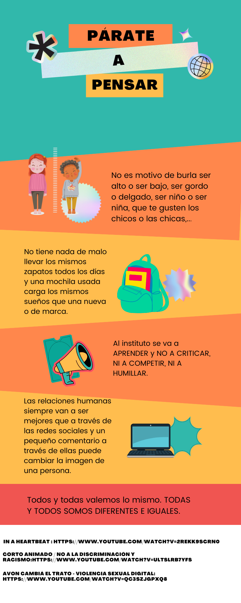 Desde el plan de igualdad se va a trabajar en el centro con distintos materiales para concienciar que Todos y Todas somos diferentes pero iguales, y desarrollar en los alumnos que todos valemos lo mismo.